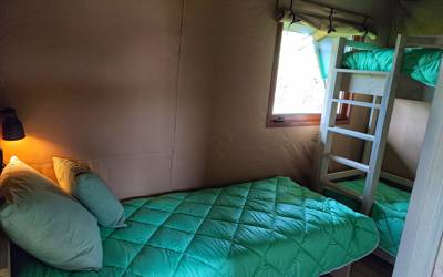 - 2 lodges voor 5 personen: Twee slaapkamers – een met een 2-persoonsbed en een met een 1-persoonsbed en een stapelbed.